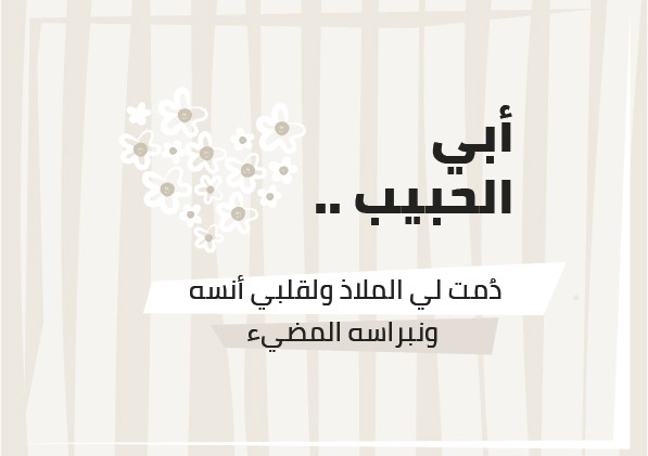 أباهي بك الكون والدُنيا.. وتشرق روحي من إشراق روحك.. أبي يا سعادتي الدائمة وذُخر أيامي وفخرها.. أعيذك من أن تُتعب الأيام كاهلك ولم أنشر على وجهك زاهي البسمات